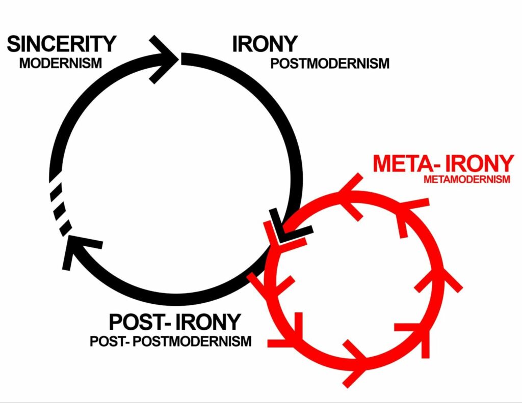 Starting with sincerity, then moving to irony, and then moving to either post-irony or meta-irony, with post-irony portraying the return to sincerity from irony, a sincerity that has passed through detachment and come back changed, that uses the aesthetics of irony to slip past our algorithms undetected, and meta-irony being an absurdist self-referential loop that can only be decoded by those in the know, and even then, may not even have anything to say.