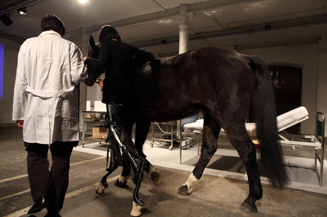 The performance took place in Ljubljana in 2010, and it is an attempt at a hybrid man-animal existence experience carried out by injecting horse blood into Marion’s body. To avoid the immune reaction against the horse blood, red and white cells were removed from the horse’s blood and Marion was injected with increasing doses of several horse immunoglobulins over a period of a few months. On the day of the performance, she also tried to communicate directly with the horse while donning some custom-made horse stilts. This sort of ceremonial animal-man communion or blood brotherhood raises debates on barriers between species and the supremacy of humans over animals.