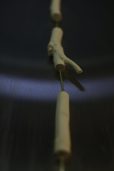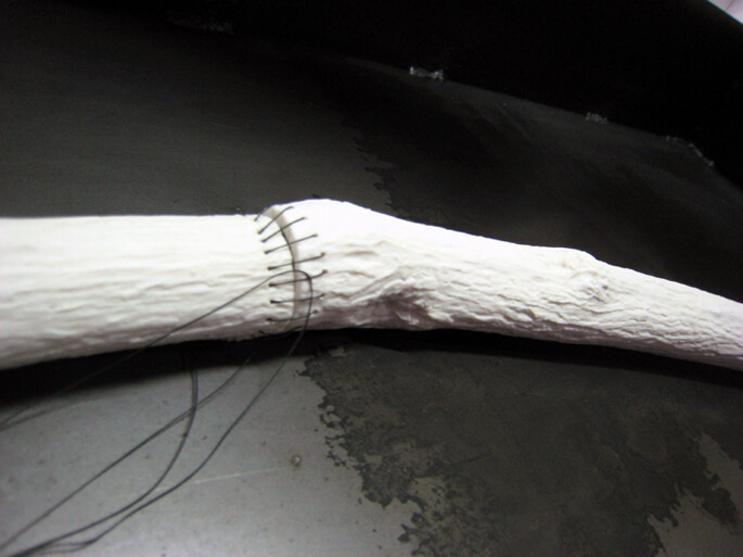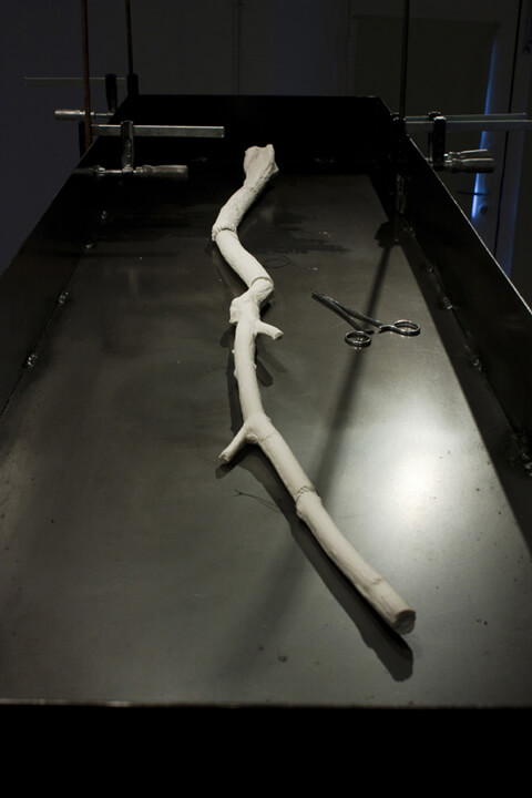 In early projects like Holy anorexia, thorned fork and spoon become the weapon of pain infringement. But Cecilia’s sculptures also materialize in a variety of organic forms: wounds (Wound X) and horns (Carnu) with slits that open as if about to talk. In Complete Quixotan escapes and the fractured self, fragmented bone-like sticks evoke us to personal journeys. Are the fractured sticks an aid for these journeys or a metaphor for our fragility?