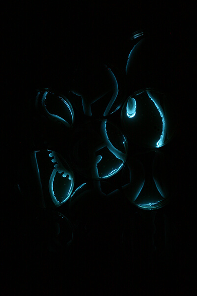 In my work, I use bioluminescent bacteria to produce drawings on Petri dishes and photography with bioluminescent light. I have incorporated a variety of scientific concepts, and political, and ethical issues in my art, such as human cloning, evolution, and biological warfare.