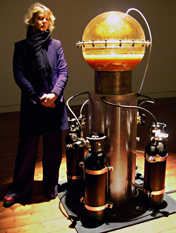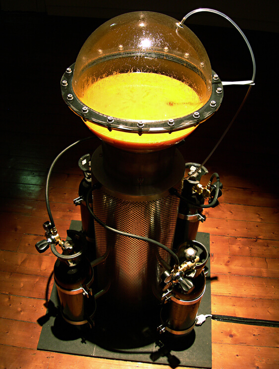 However, the project which best defines Nina Sellars’ conceptual framework is Blender, a collaborative installation with Stelarc. In Blender, the body is seen as a set of tissues, cells, fat, blood and electrolytes, used only as an anatomical entity. For this project, both artists undertook liposuction operations to create a mixture of 4.6 litres of subcutaneous fat, which circulates within Blender.