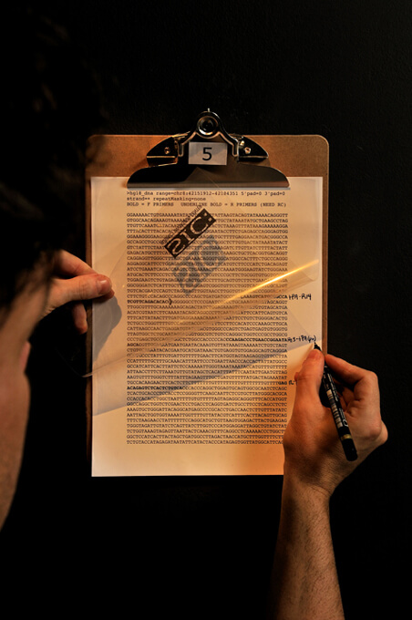 The image of the DNA fingerprint (an individual specific DNA band pattern) as the ultimate truth is put under scrutiny with extremely aesthetically appealing pieces like Relative Velocity Inscription Device, Latent Figure Protocol, Ocular Revision or Suspect Inversion Centre.
