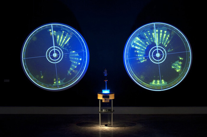 Suspect Inversion Center, Ernst Schering Foundation, Berlin. Paul Vanouse and Kerry Sheehan performing (2011). Photo credit: Axel Heise