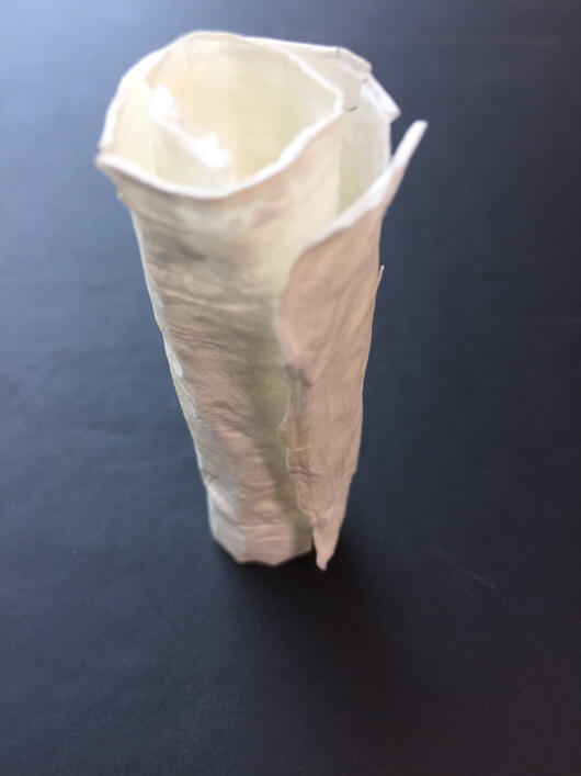 The bacterial cellulose that we used to make Origin of Species is rather brittle, and so we are seeking ways to make its properties more paper-like. In this respect, we have recently developed a simple treatment that does just this and results in a type of bacterial cellulose that is white and can be folded, which is much akin to paper (Figure 4).