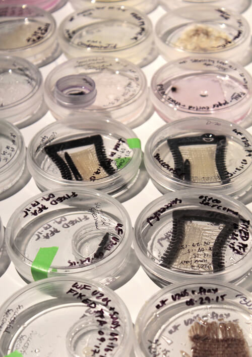 Crafting Biotextiles is a research-creation residency project developed at SymbioticA (Perth, Australia) in which wet biology and creative crafts techniques are overlapped to develop textiles patterns.