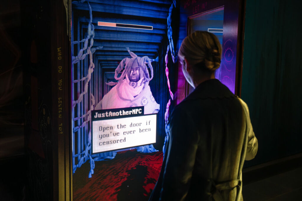 I DIDNT REALISE YOU THOUGHT LIKE THAT (2025) is the first artwork we encounter. After introductory audio (‘the hate is pungent–who will you tolerate?’), various characters appear on a screen behind the transparent door and present their views; visitors decide whether to close the door, accepting or excluding them. One character says we should stop using fossil fuels completely. Someone steps out of the crowd and confidently closes the door on their green dreams. It’s not the answer I expected–I imagined more of a Just Stop Oil crowd. There’s no discussion, just a strained silence as we wait for the countdown bar to finish.