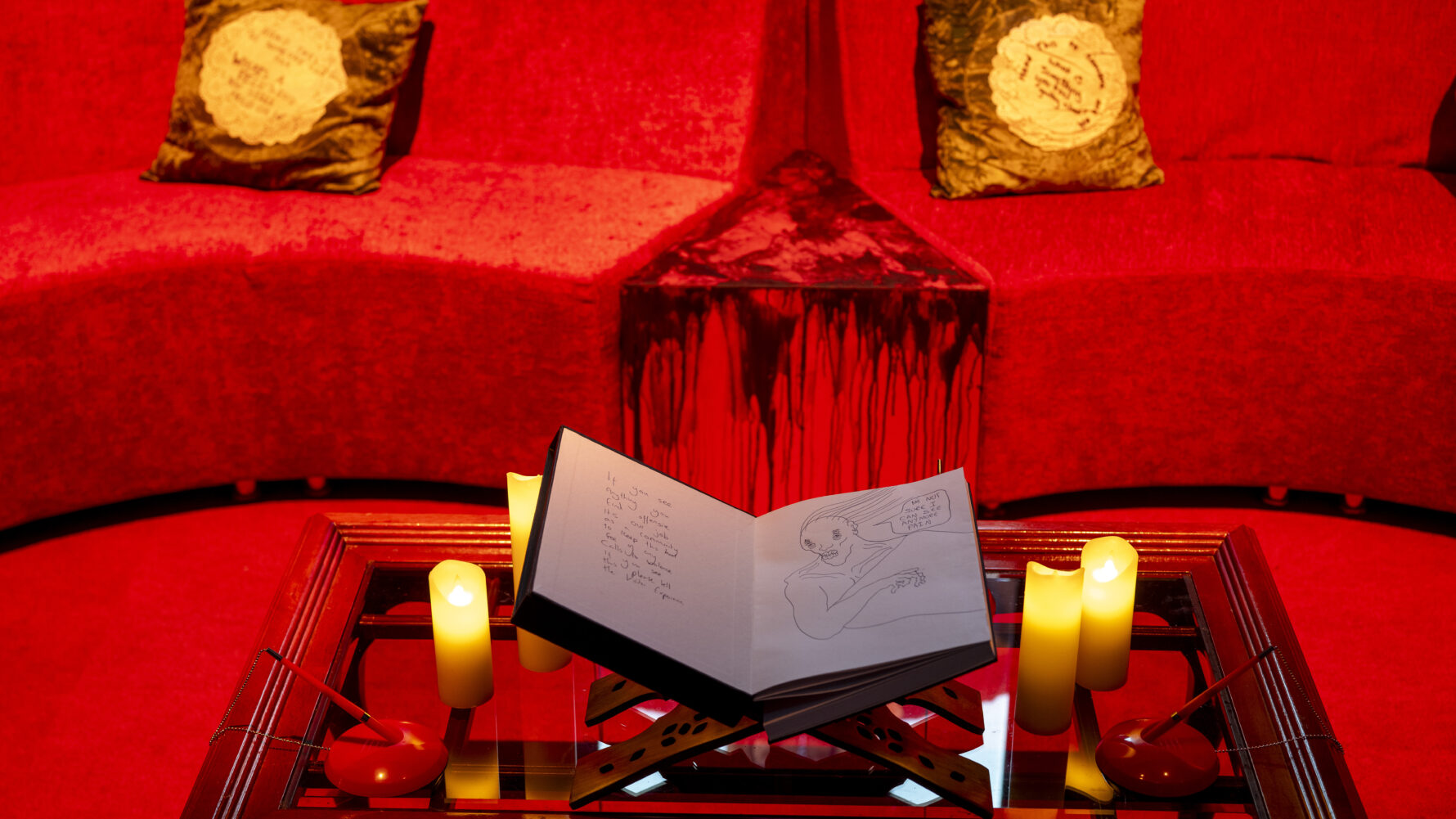 At other times, the exhibition isn’t really pro- or anti-digital, but agnostic: sometimes technology fails altogether, presenting an offline option. It’s a relief to find that the fourth and final game, TO REMEMBER YOU BY (2025), isn’t digital and isn’t really a game. We’re asked to record how we feel in a book, and it’s full of delightful doodles. Here, the sofas and well-stocked bookshelves finally present an antidote to the games, something informed and unhurried. The doodlers and I, reunited from the table-tilting game, claim (only half jokingly) that our drawings are the best artworks here. But we’re laughing with people we met through the game-artworks, so maybe Brathwaite-Shirley is the real winner.