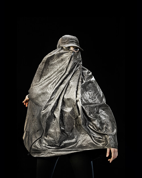 Stealth Wear is a three-piece collection —a burqa, a scarf and a hoodie— that makes the wearer invisible and protects them against the thermal technology used by drones. Other projects developed by Harvey which focus on reclaiming privacy for us, are Camoflash — an anti-paparazzi clutch —, CV Dazzle — a makeup that protects us from facial recognition— and OFF Pocket — a pouch that blocks the phone’s signal when covered.