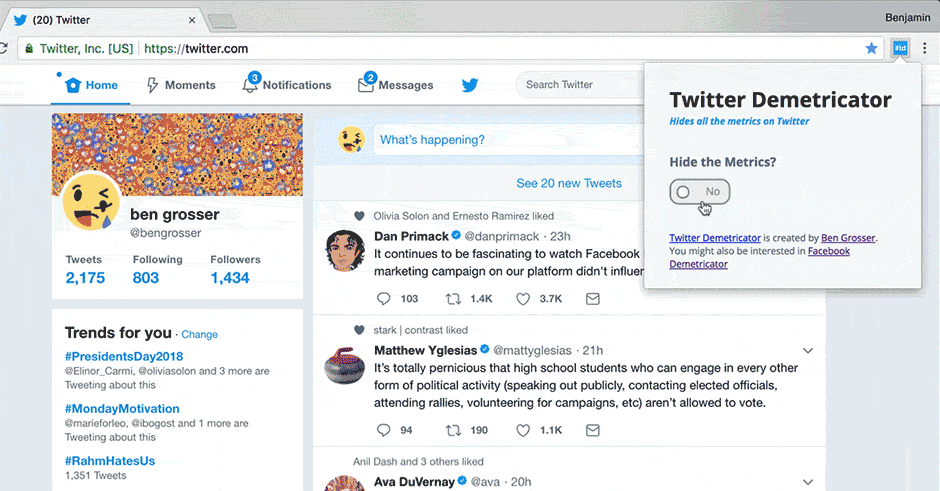 Some of the common themes with Demetricator are that its removal of visible numbers from social media platforms blunts feelings of competition (e.g. between a user and their friends), removes compulsive behaviours (e.g. stops users from feeling a need to check for new notifications constantly), and overall, reveals to users just how focused they have been on what the metrics say. When we see how many “likes” our last post received, we can’t help but take that into account when we write our next post. In other words, the metrics are guiding and changing what we say, how we say it, and who we say it to.