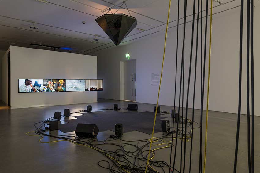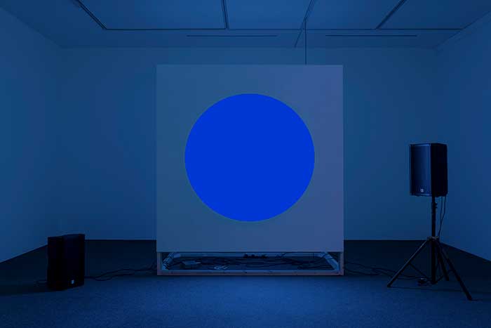 The exhibition displays digital animations, videos, audio, LEDs, multichannel sound installations, sculptures, and a sound chamber. The works exhibited include Skip_loop (2019) shows a digital animation of the sea which collapses in six-second intervals; /\/\/\ /\/\/\ (2017) —read as “Aquarius”— is a multimedia, multichannel installation and sound chamber in which the viewer experiences sound and videos.