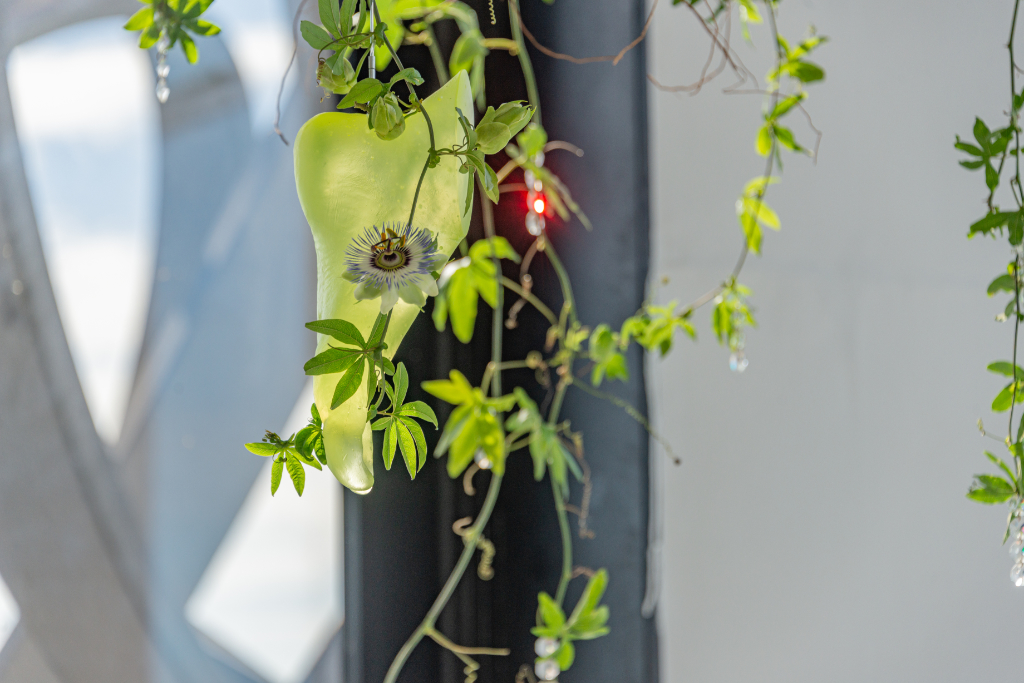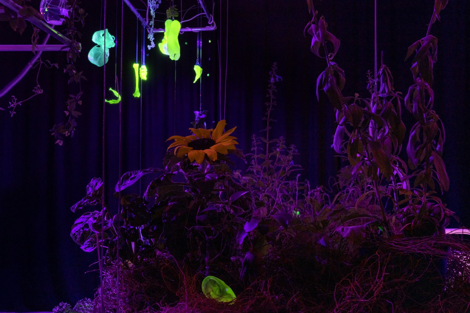 We’ll start with the materials that you work with in your installations. You combine natural materials like plants, water and earth with human-made elements like glass, lubes and textiles. How does this opposition function in your work?