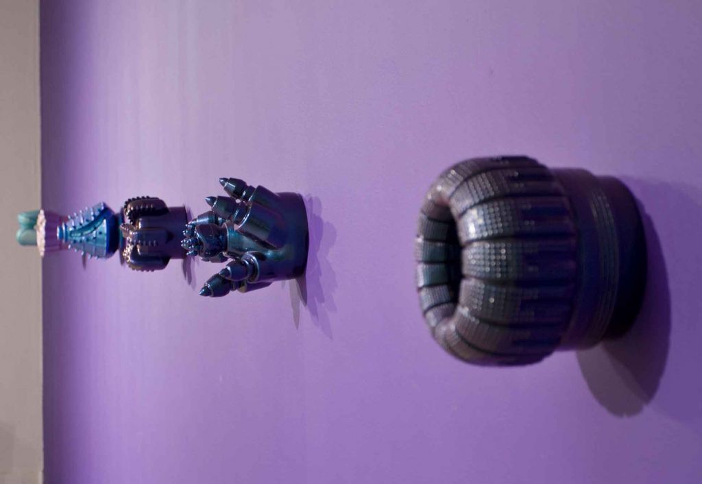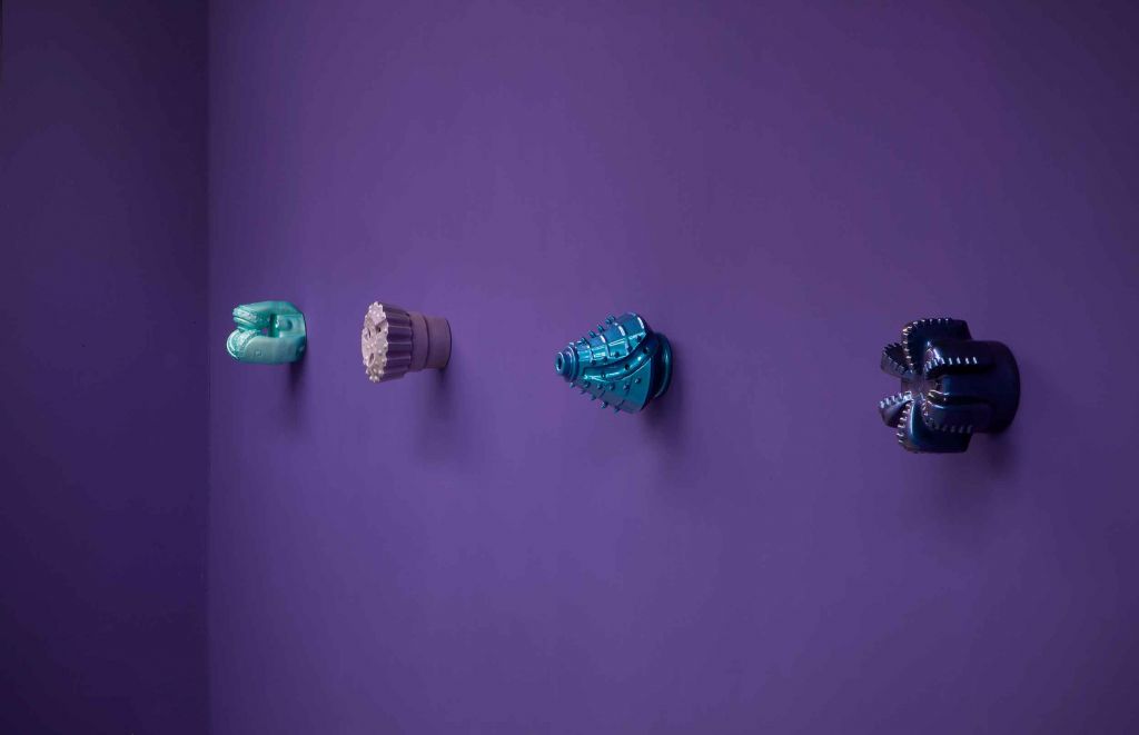 Differing from Alien Technology in terms of presentation and size, the work Spectrum (2016) can serve as an example of the illusionist temptation Al Qadiri’s works excerpt. The precise models of different drill heads lined up along the wall, shimmering in dichroic colours, mesmerisingly lure the mind into transforming these technological tools into secretive relics of alien sea creatures or rare pearls. The viewer’s imagination constantly travels between the functional reality of the models and their mystical aura.
