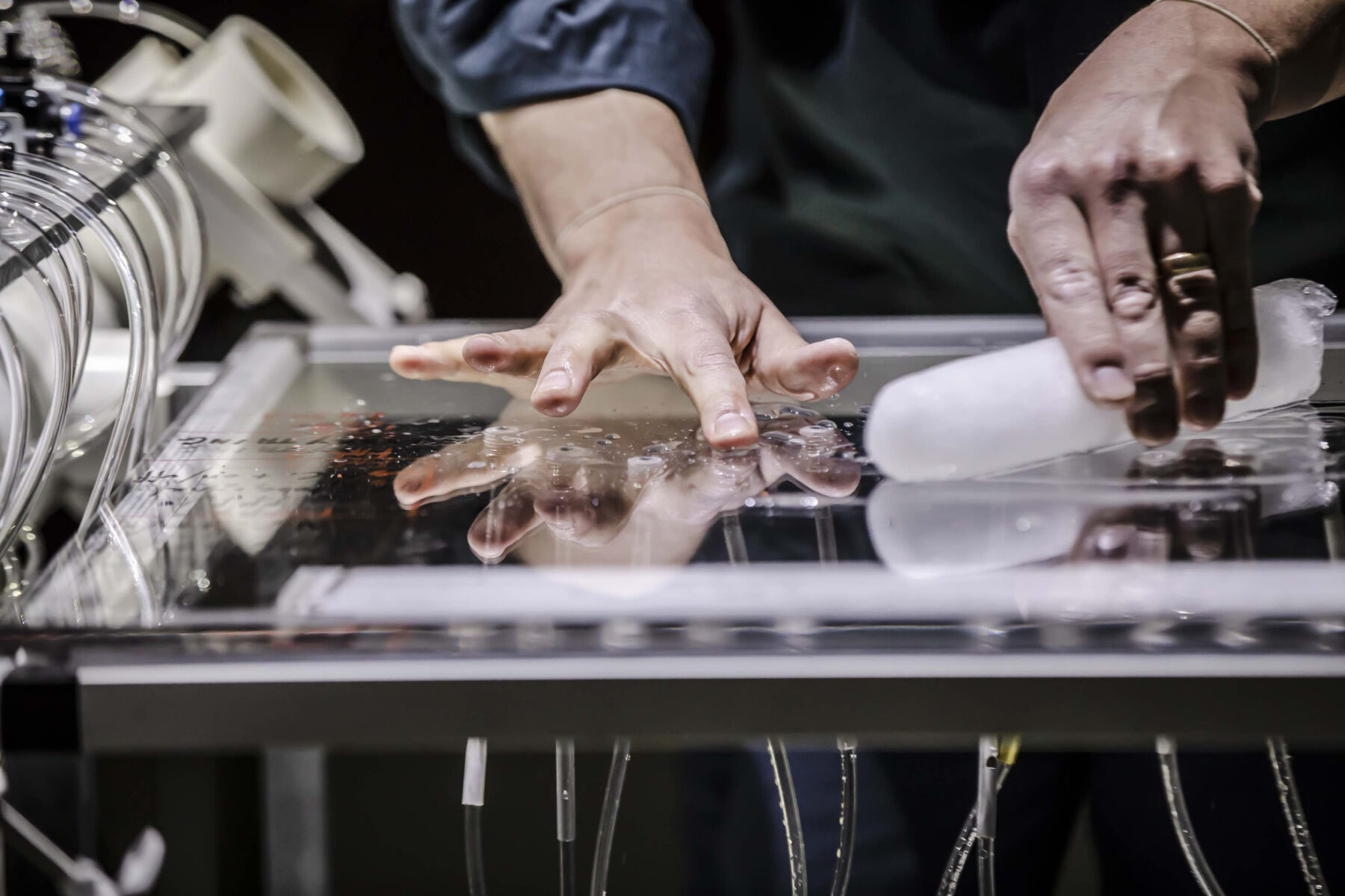 My goal in this project was to conceive of a bespoke instrumentation designed to manipulate the same raw materials captured in the field; wind, ice and water. After a substantial collaboration with the RMIT Industrial Design School, Malte Wagenfeld and Nick Roux, we achieved our goal of having constructed an entirely new set-up of acoustically activated instruments for the project. I wanted us to look and feel like scientific researchers rather than music, and this was reflected in the design.