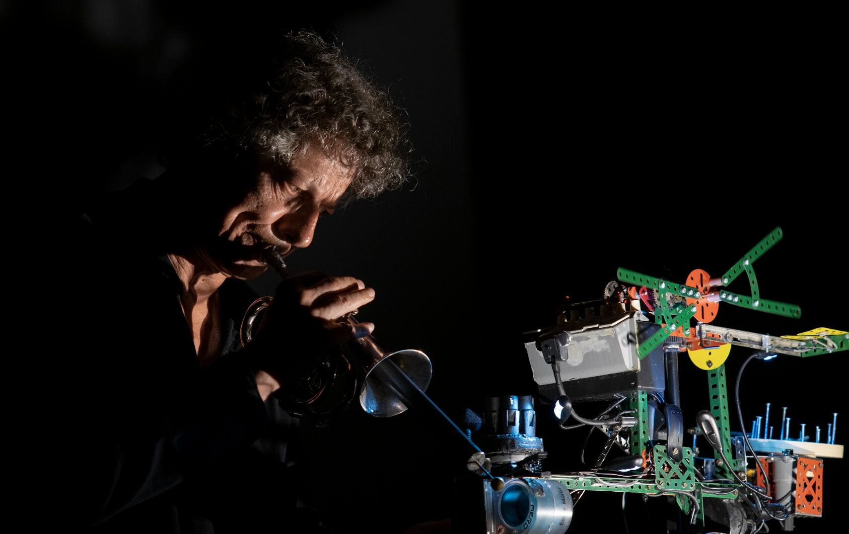 In 1976, when I brought a self-built machine on stage for the first time, I was unaware of any similar experience in the field of « free music », as it was called back then. But I knew the existence of Mauricio Kagel’s Zwei Mann Orchester, with its two performers activating a huge sound installation, and I was a great fan of Heinz Holliger’s Cardiophonie, a solo piece for oboist playing along with the sound of his own heart rate.