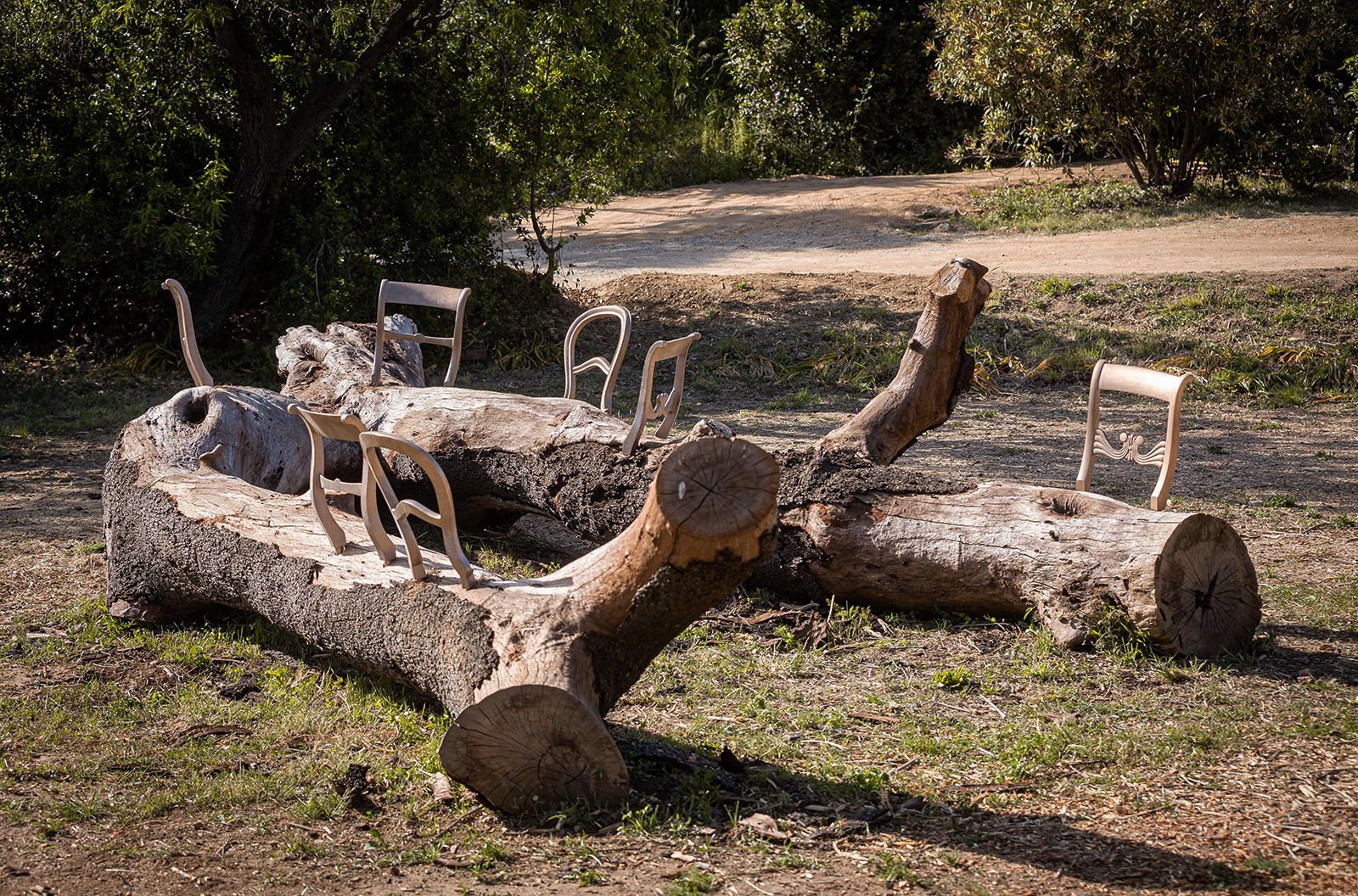 We want to create an experience for all the senses. It will be an eclectic programme of music, art, food and wine, taking place all over the site: in the quarry, the forest, the vineyard, the patio, etc. The programme should be contemporary, innovative, and cutting edge. Essential is the beauty of the location, its wild and natural space, which we both respect and use as inspiration. The Tree Trunk Bench by Jurgen is there because we found a huge dead tree on the grounds. Bronze-cast classic chair backs have been inserted into the trunk, merging nature and culture. Visitors are greeted by a personal map of the area, drawn by Dutch artist Jan Rothuizen based on his observations from observation walking around and talking with passers.