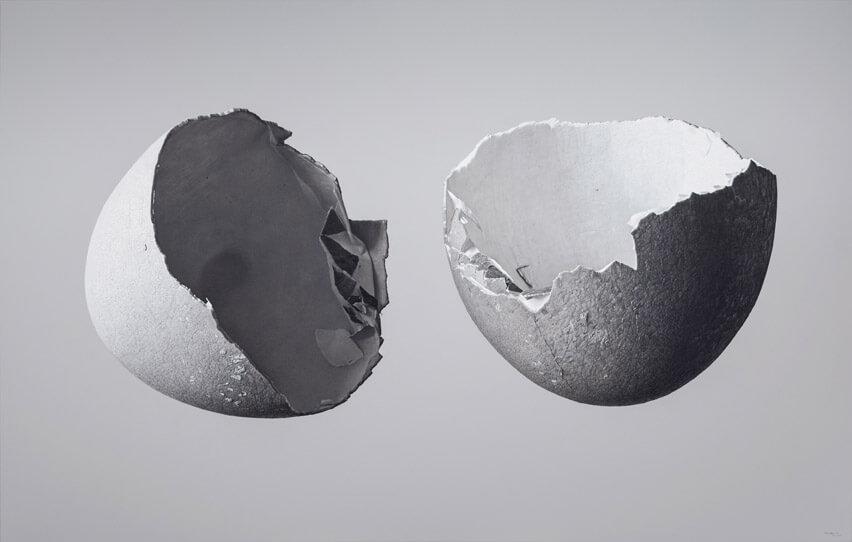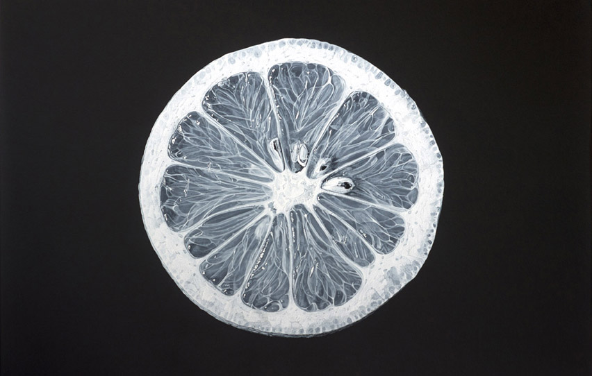 Two series caught my attention: Zoom and Macro. While Zoom is a set of acrylic and pencil monochromatic and hyper-realistic drawings of reality bites as light bulbs, orange slices and pencils, Macro is a series of atemporal sculptures made of polychromed polyurethane, aluminium, felt and epoxy which helps create a new sense of our physical world.