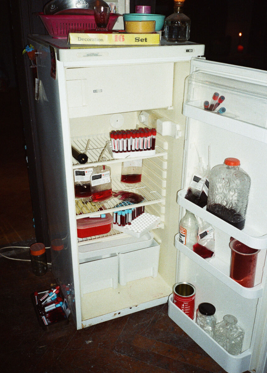I’m rushing on foot past motorcyclists and voices yelling out across the traffic lanes, eyes bent to the images bleeding out in my hand. I’m struggling to make sense of the photos I’ve been sent: a brainy facemask in the shape of a cock’s helmet, a silicone pig-head bra, various fake-blood consistencies splashed onto a blank page, a spinal column. Hello, dear, reads the attached message. Running late from the prosthetics meeting.