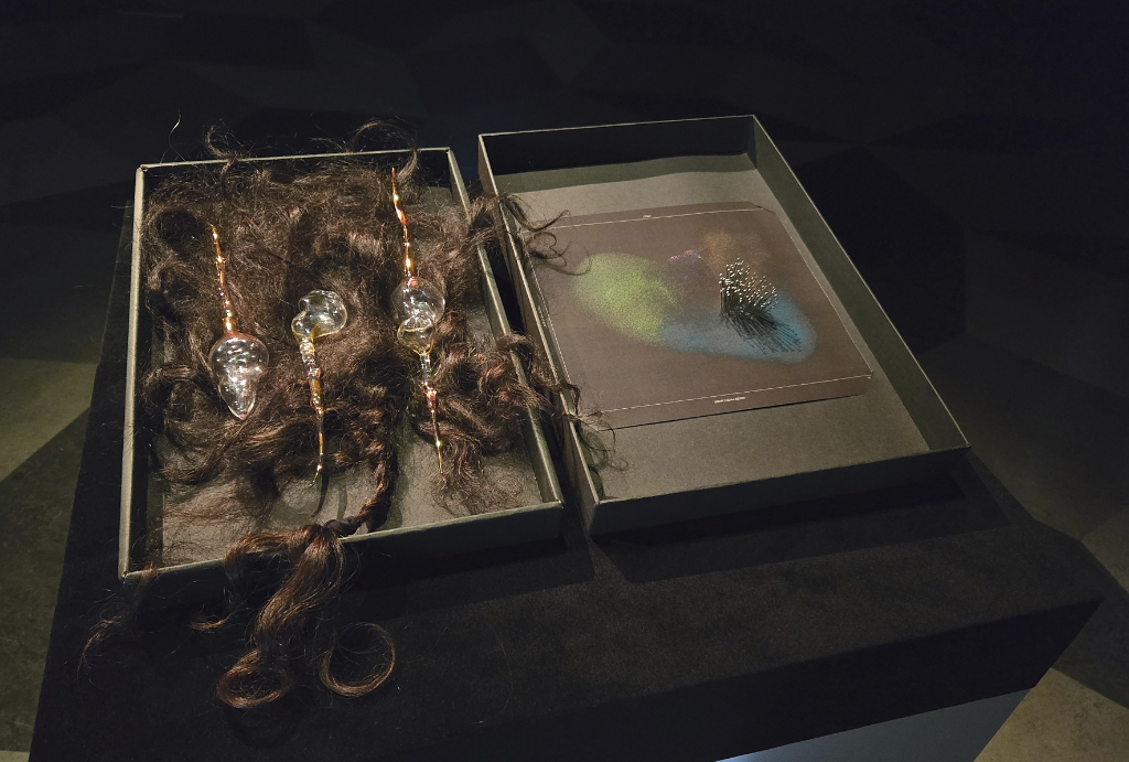 Taking on a more internal examination, Hlymia [2] turns Pevere’s artistic gaze upon her own body, narrowing in on her ongoing autoimmune condition of Psoriasis. In this instance, the endless cycle of killing of the artist’s healthy skin cells by her lymphocytes causes ongoing inflammation, skin flaking, and fatigue. Hlymia transforms the bodily artefacts of the artist’s shaved hair, analysis of the artist’s lymphocytes, and a diagrammatic artefact constructed with metal pins pointing to the T-cell population linked to the condition, all of which become part of a diptych, transformed into a devotional object. The work has been shaped by a residency Pevere has done with the Experimental Immunology department at the Helmholtz Centre for Infection Research in Braunschweig.