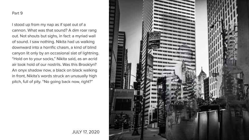 In June 2020, VOIDOPOLIS began unfolding a narrative in a series of 40-ish posts on her Instagram account (@kmustatea). Inspired by Dante’s Inferno without Virgil’s guidance, the charming Nikita takes us on a journey around the ghostly empty streets of New York, informed by the peculiar mix of hellishness and banality experienced in the City during quarantine periods.