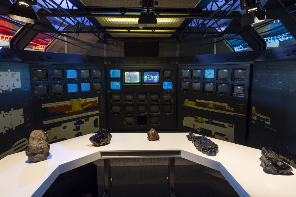 Cyprien Gaillard’s Suspire (for ICC’s control room) seems to purposely point to this interplay between the surreal atmosphere of the place and the down-to-earth politics behind its fate as an asbestos-contaminated structure. One finds crystalline formations made from mould asbestos in a small space near the entrance. Gaillard turned this toxic substance that once led to the closing of the building into strange rocks that appear like souvenirs from a distant planet. The fact that asbestos became widely used around the same time as the first successful moon mining event in 1972 – just a few years before the opening of the ICC – puts weight on the many associations sparked by the installation.