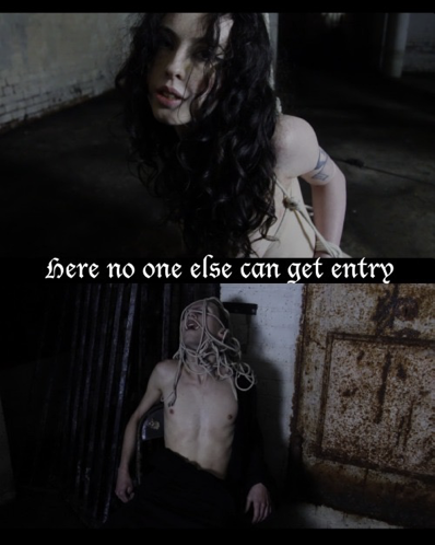 In Projection 2, ‘Daughter Caligari’ is a headmistress of a rogue mental asylum. Her body is spread across the Dungeons’ gate, weaved within a tortoise shibari cocoon. Her transsexual patient, performed by Mistress Maya, who suffers from severe ‘nympholepsy’, transforms herself into a sadistic nurse. She involves Caligari in the therapy of riddles, questioning her monstrous desires.