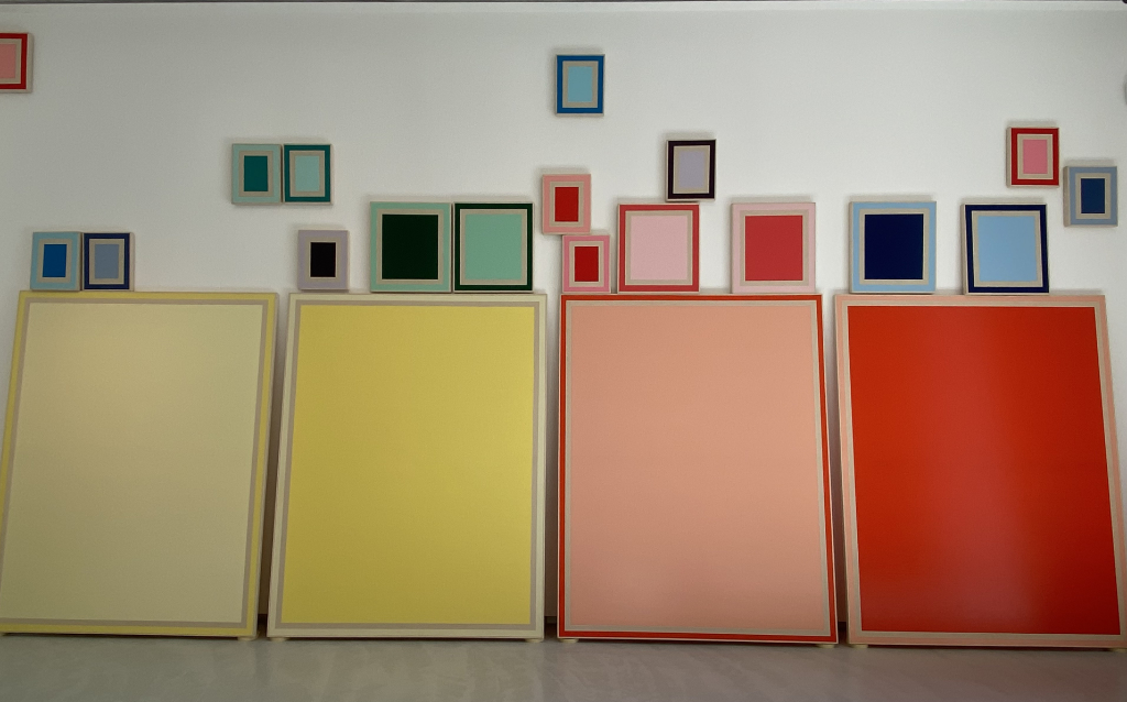Turning to the left, one is drawn into a room filled with similar colours, some more chromatically intense, others almost identical, but in a format completely opposite in two-dimensional evenly painted rectangles leaning against a wall. Programimage, 2018 by Ádám Varga, is a dancing array of small and large rectangles of colour, each painted flat with a lighter or darker frame of acrylic paint, simulating the flickering effect of electric light in the manner that our eye’s dance around the alluring colours bouncing from one frame to the other.