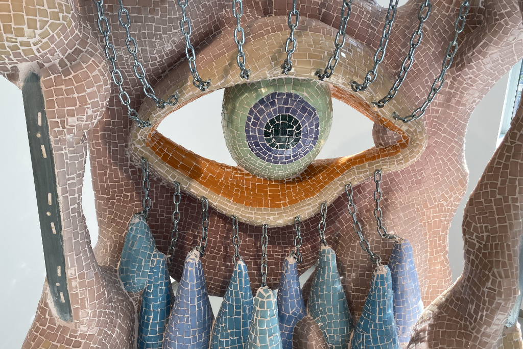 The large eye in the upper third of Lost and Found immediately brings to mind the occult and the mysteries of the unconscious. These works are fanciful and gentle on the eye, with curving undulating surfaces, adorned with mosaics in delicate pastel colours, almost as if a watercolour emerged from the page into a three-dimensional plane. What was once flat becomes sculptural, fluid and frozen in place, reminiscent of the movement of mercury.