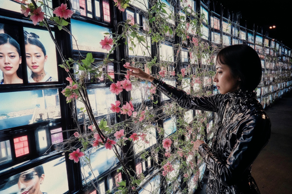 The concept of memory is key in Kusano’s piece. Memory is incredibly fragile — it’s constantly being rewritten through the brain’s electrical signals and chemical reactions. Each time we recall something, we’re not accessing the original moment, but a new version created by our biology [5]. Ghost Interrogation immerses participants in a cyberpunk-inspired interrogation chamber where a mandala-like sculpture of stacked CRT monitors projects fragments of Kusano’s private memories alongside AI-driven reconstructions. Compared to the “typical Japanese beauty” that AI tends to generate, my image introduces a strange kind of imperfection, an uncanny humanness. In one of my large-scale series with over a hundred images, my face dissolves into a crowd — somewhere between myself and someone who doesn’t exist. I find that moment of ambiguity very beautiful. In that sense, I treat myself as both the material and the ghost within the machine” explains Kusano [6].