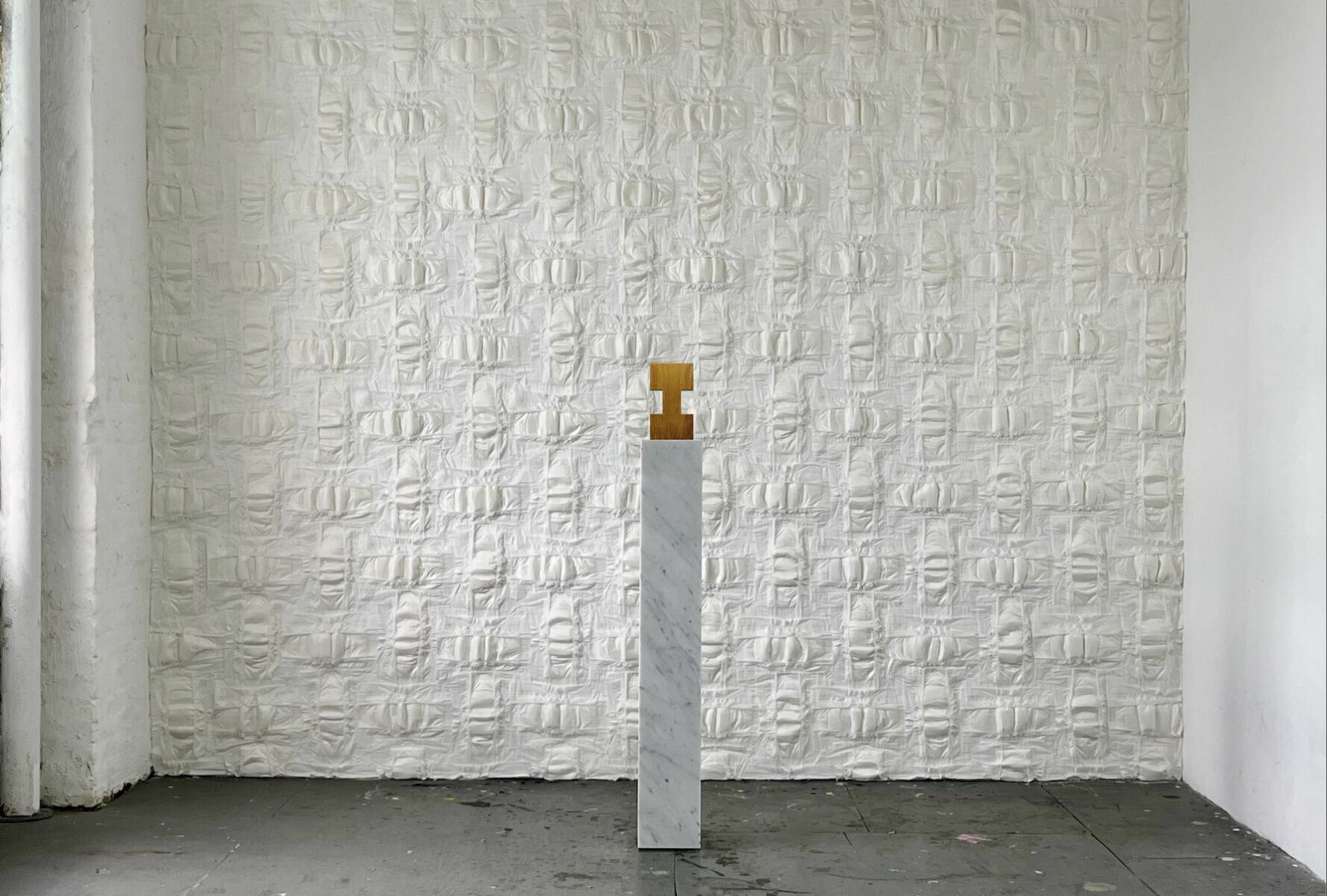 From the foundations, The Wall calls on deep time, lineage and bloodlines exhumed through its reproductive ties and resistance to entropy – its diaper weave taking 500 years to break down in landfills, worldwide. On the opposing wall, Freehold binds the infinite to the imperial, the domestic to the constitutional. Mounted on Baltic birch plywood and grounded on Lincoln Memorial marble, the vertical plane of woven newborn diapers materialises as a living contract where liberty is codified in ownership, labour and control, where freedom is something held and constrained.