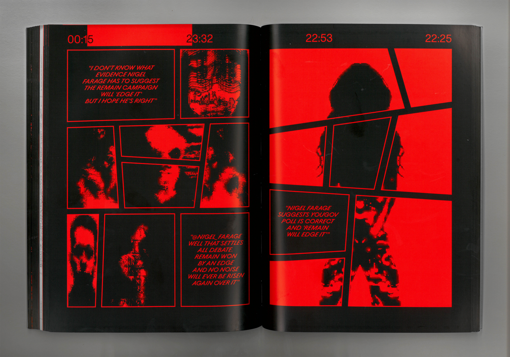 The 20-minute performance begins at 21:59 on June 23rd 2016. It concludes at 04:46 the following morning, aggregating into a single timeline thousands of tweets and retweets echoing Farage’s concession, the millisecond-by-millisecond index of the value of the Pound in the Dollar market, and the timestamped, local Referendum result announcements. At almost all points during the performance, a timer indicates where in the night is currently being depicted.