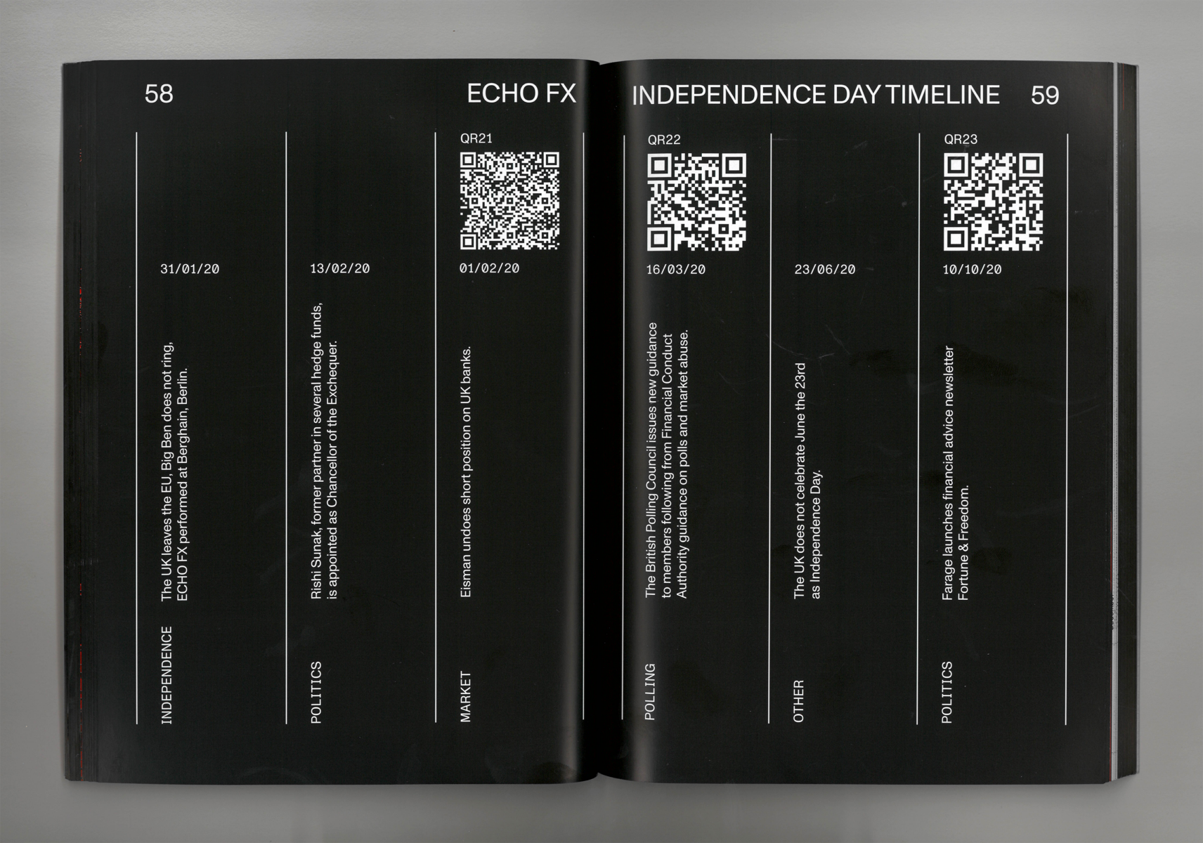 Audiovisual performance ECHO FX by London and Berlin-based duo DMSTFCTN replays the night’s events by tracing the effect of Farage’s concession in its memetic tweet form and its impact on ForEx markets. First shown at London’s Corsica Studios on the third anniversary of Referendum night as part of Hyperdub’s party series Ø in 2019, it was then performed in Berlin’s Berghain 48 hours before the UK left the EU, as part of CTM x transmediale festival in 2020. ECHO FX was released by Krisis Publishing in 2021 as a digital download and book featuring essays and visual contributions expanding on the themes of the performance, following a release announcement given by Farage himself on the fifth anniversary of the Brexit Referendum [1].