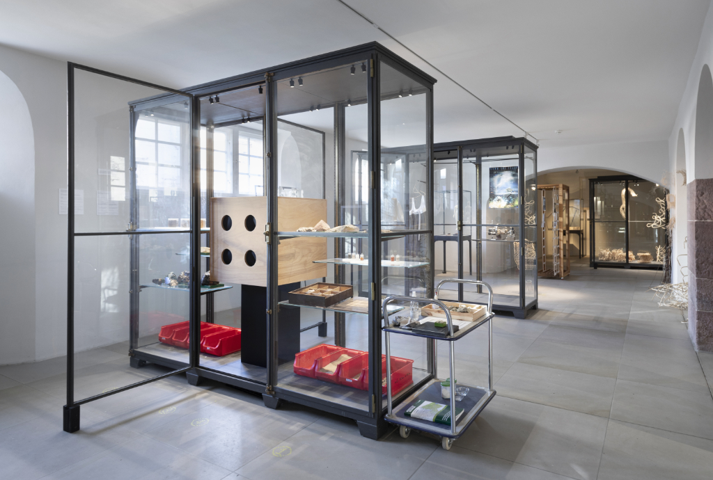 One of Berlin’s oldest educational buildings, the early classical theatre with its copper dome, immediately catches my eye as I enter the courtyard. Inside, the show is introduced with a room dominated by a diverse range of old and heavy glass vitrines. The stones and minerals from the collection create the impression of being in a natural history museum. However, this institutional vibe is interrupted once my attention wanders to the margins of the room. Here, on the side of a vitrine, stands an inconspicuous cart with various objects on it.