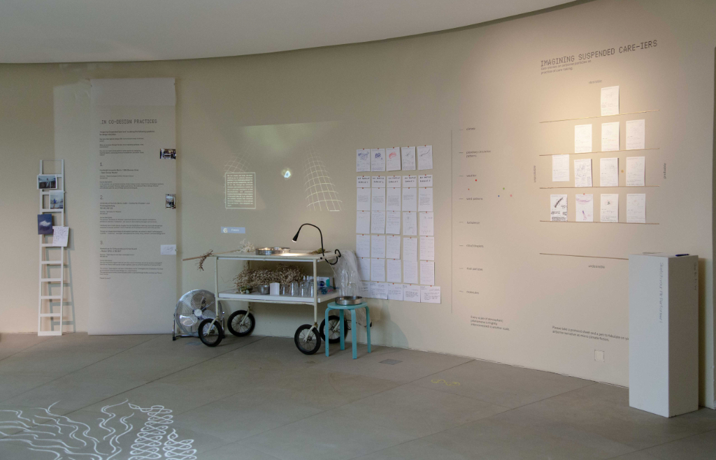 In a departure from the convention of the finished and untouchable exhibit, the project group members have taken seriously what it means to allow non-human actants to get involved. In fact, it might mean practicing what the design researcher describes as letting go as contemporary way of designing. Instead of bringing in a finished work into a defined curatorial frame, he spent the last months gradually setting up his installation.
