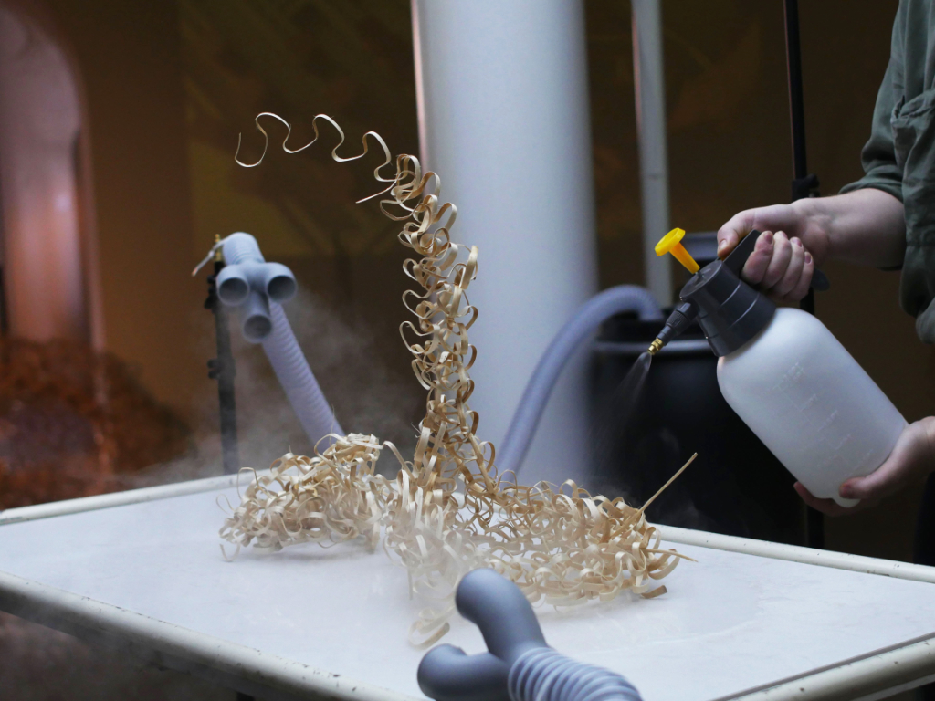 For instance, this effect can be seen in a funnel-shaped woven willow structure by architect Natalija Miodragović in cooperation with Nelli Singer and Daniel Suarez that collapsed throughout the exhibition due to the humidity in the cloud installation. The presence of the visitors’ bodies in the space immediately enters the chemistry of the cloud on a micro-level. If the moisture in the cloud triggers a weathering process in a stone, does the visitor* become part of that weathering, or even the stone itself? asks Winkler.