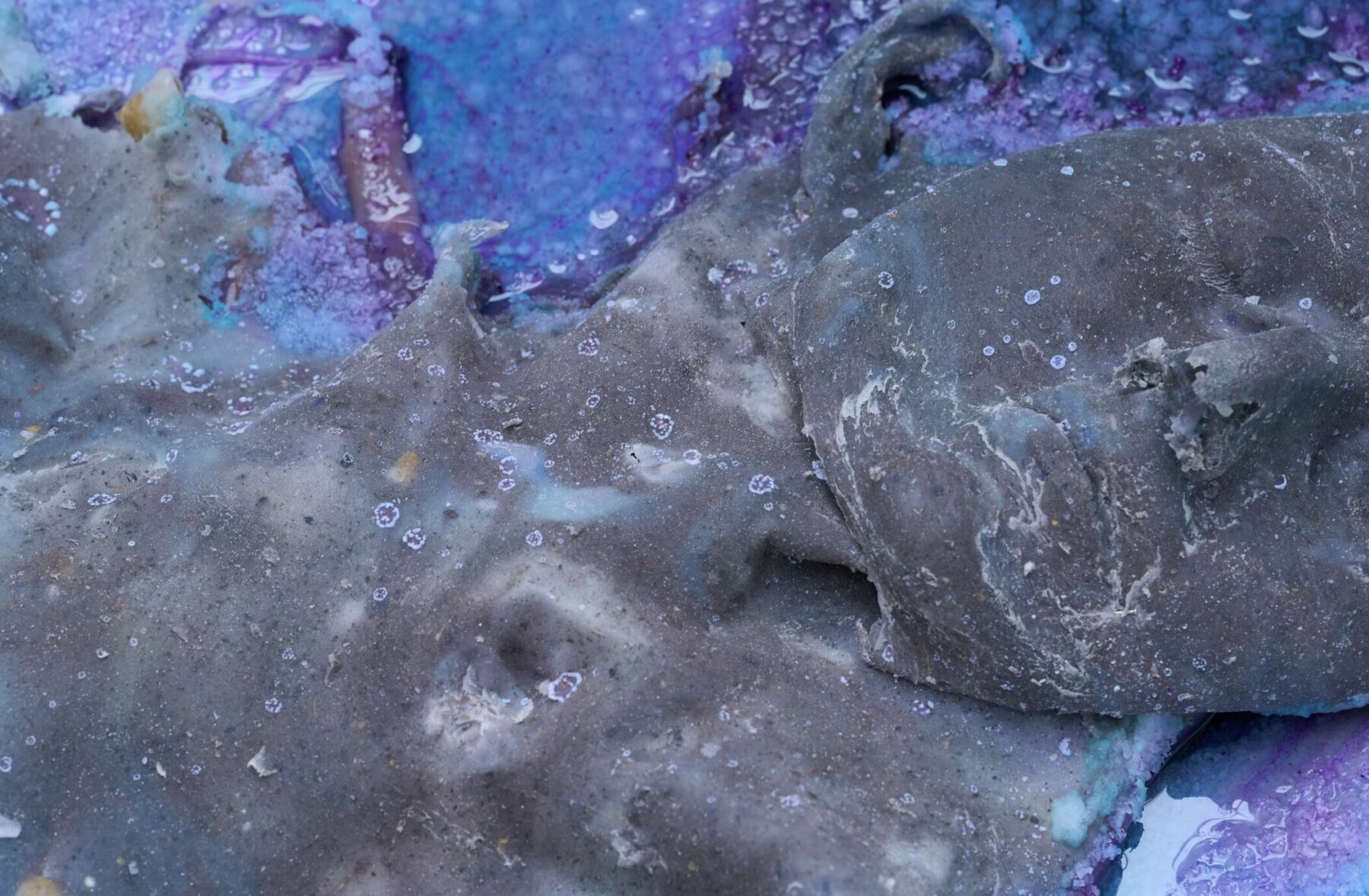 Many of Marguerite Humeau’s renowned installations stage the Anthropocene as a brief interruption in geological time, imagining futures in which humans are gone or subsumed by other species. Her ongoing sculptural series Mist/High Tide, presented worldwide in several iterations, wonders whether climate change might generate spiritual awakenings in animals becoming aware of their impending death. Drawing on studies of animal mourning and mythology, Humeau imagined nonhuman species developing rituals to cope with mass death. Works such as The Dancer V (A marine mammal invoking higher spirits) (2020); The Prayer (A marine mammal invoking higher spirits) (2019); and The Dead (A drifting, dying marine mammal) (2019) take the form of ambiguous zoological archetypes whose large-scale bodies rest between life and death.