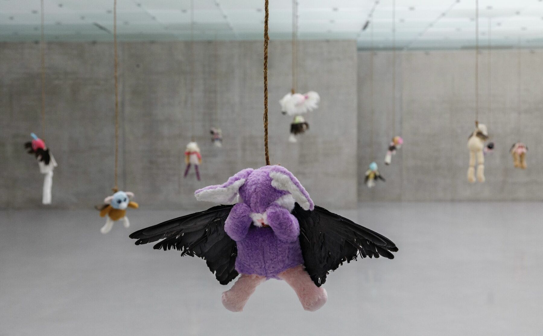 Okoyomon embraces this permeability as a way of encountering the nonhuman world without defence, allowing the self to be undone, reconfigured, or even devoured. Their recent exhibition ONE EITHER LOVES ONESELF OR KNOWS ONESELF (2025) at Kunsthaus Bregenz included a creepy installation of cute teddies assembled from dismembered plush fragments, collected by the artist over years. These beings appeared gently hovering in the space while disturbingly hanging by their necks. Angel-demons, embodiments of a subjectivity that loses itself by merging with the other.