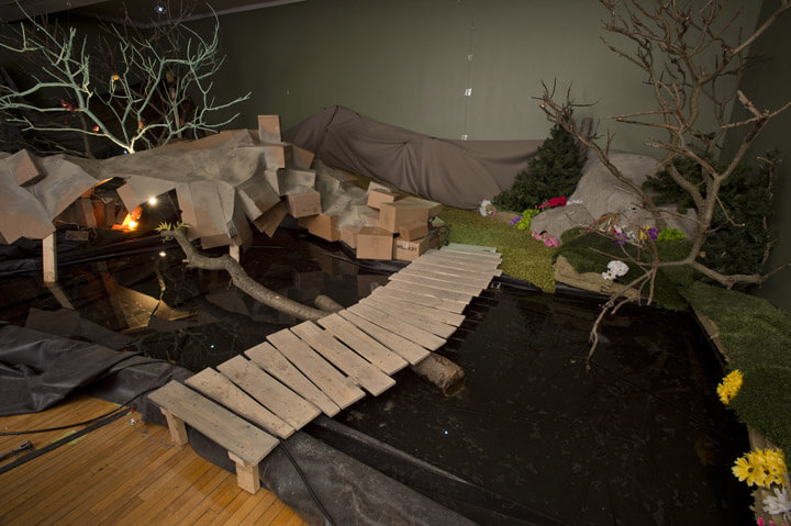 My installations and other site-specific projects take what has become familiar, or what we know to be real, and repackage it; a rotating tree, a floating shopping cart, or maybe it’s an assemblage of Christmas trees, shag carpet and cardboard boxes that standing in for a landscape.