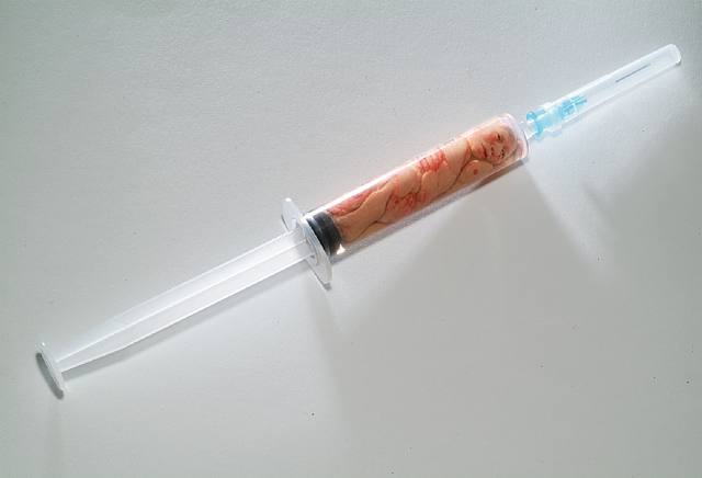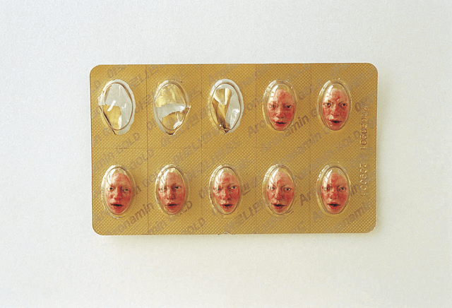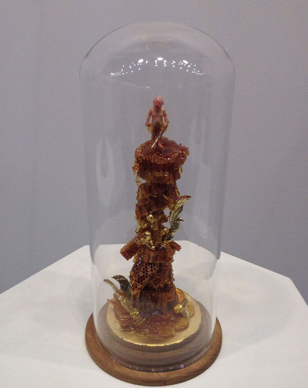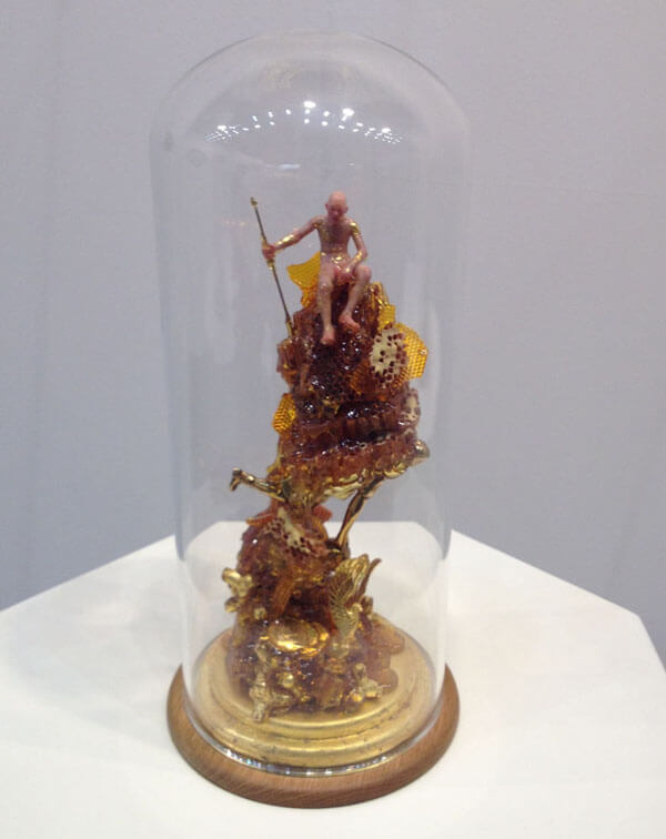 The boundaries of beauty and violence are blurred by his disturbing humanoid sculptures —naked, bleeding, piled or tied— and his compositions ranging from a pile of heads inside a pack of capsules, a human mermaid in a fishbowl or bodies inside of a can.