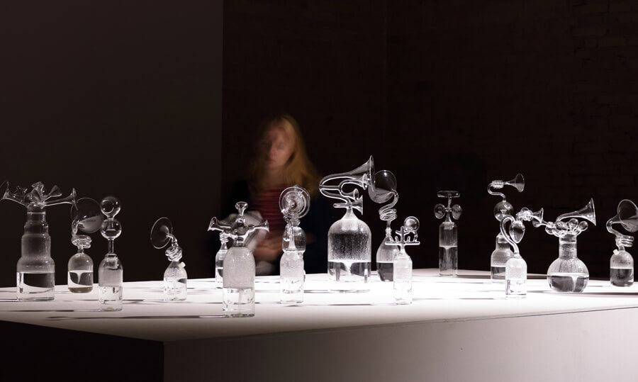 Chozumakiis the result of Akamatsu’s Sonica (Glasgow) residence in 2017. The piece takes on one of the planet’s most mesmerising natural phenomena: the vortex. From atmospheric circulation to the spin of electrons to water swirling down plugholes, the geomagnetically-induced vortex has proven to be a hypnotising spectacle. Nelo Akamatsu’s Chozumaki will appeal to anyone who has worked in a biology or chemistry lab (who hasn’t spent hours trying to get the perfect solution). Glass beakers shaped like a cochlear duct, each one containing a continuous vortex produced by a magnetic stirrer, whirl endlessly in water; there’s a sort of mantric meditative repetition in sight and sound of these water vortex.