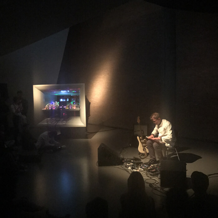 We had a chat with Schneider™ before the event, asking him how he got involved in playing alongside cellF: Jan Rohlf of CTM asked me if I would be interested in improvising with this rudimentary artificial brain being connected to a modular synthesiser …how can I say no? In general, I am most interested in communication through sound these days, and this is an excellent occasion to get in contact with something else than the usual another musician (s) or a normal human. I will bring different kinds of equipment to process the sound of an electric guitar to have diverse sound possibilities. A day before in the soundcheck I will try to find out what’ll work best to get in touch with the CellF and then decide which way to go & play, he told us.