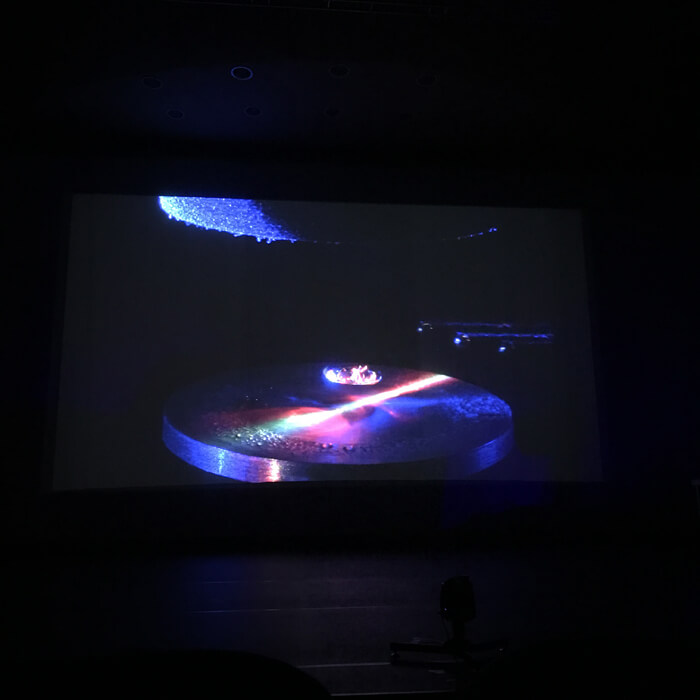 The piece they presented in Technosphärenklänge#3, Force Field, is a performance developed in collaboration with Paul Prudence. It is hard to put into words the aesthetic appeal and elegance of this piece where acoustically levitated water droplets bounce and fuse like graceful otherworldly dancers while the vibrations of the drops are amplified making audible the slippery materiality of water shapes. We all left the HWK auditorium moved after the show.