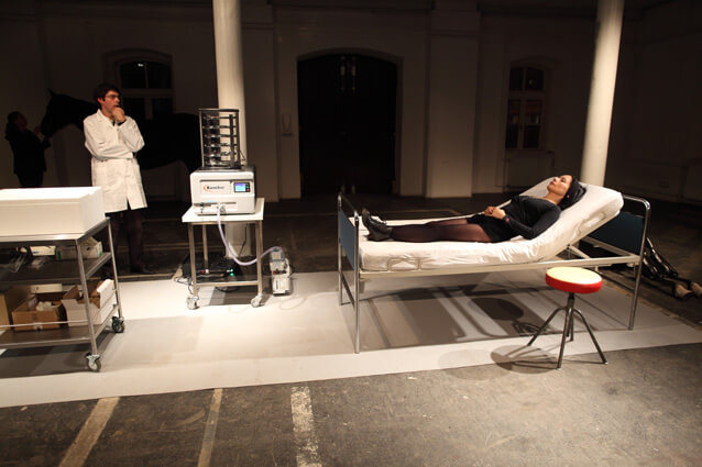 The performance took place in Ljubljana in 2010, and it is an attempt at a hybrid man-animal existence experience carried out by injecting horse blood into Marion’s body. To avoid the immune reaction against the horse blood, red and white cells were removed from the horse’s blood and Marion was injected with increasing doses of several horse immunoglobulins over a period of a few months. On the day of the performance, she also tried to communicate directly with the horse while donning some custom-made horse stilts. This sort of ceremonial animal-man communion or blood brotherhood raises debates on barriers between species and the supremacy of humans over animals.