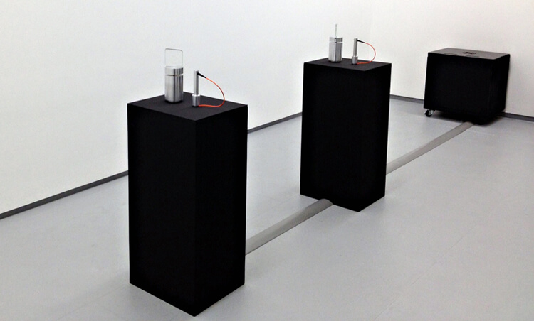 However, the project which best defines Nina Sellars’ conceptual framework is Blender, a collaborative installation with Stelarc. In Blender, the body is seen as a set of tissues, cells, fat, blood and electrolytes, used only as an anatomical entity. For this project, both artists undertook liposuction operations to create a mixture of 4.6 litres of subcutaneous fat, which circulates within Blender.