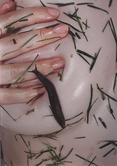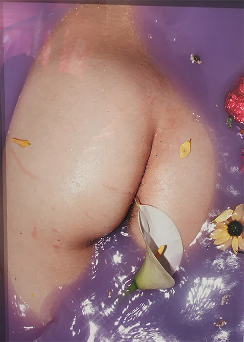With liquids glimmering on the surface enclosing the female flesh, spilling over pink flowers and vibrant fruits, we become immersed with the images, imprisoned into the body itself. Through the explicit use of macro imagery, grass, peonie, bum is juicy, sticky and highly visceral, enhancing the fluidity of sex and gender. Maisie’s work actively responds to destructive images aiming to address the damaging misogynistic ideals of beauty.