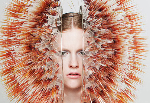 Maiko finds inspiration in nature and the environment. She plays with shapes, colours, shadows and movements to build a collection where the intangible turns into the physical. Yellows, blues and greens remind us of the environment and designs inspired by jellyfish, sea urchins, or sea horses are in delicate harmony with nature. Maiko Takeda’s headpieces are not only fashion accessories; they are wearable sculptures. When you wear them, you live in a surreal moment feeling like a piece of artwork yourself.