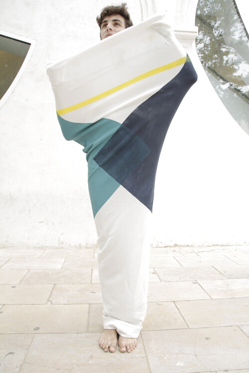 The result of this new approach to the design process was the incredible The Wearable Fashion Orchestra (2014), a project in which signs and symbols are translated into a new e-language—a collection of garments connected with a WIFI mesh to a computer that is worn by dancers. The Wearable Fashion Orchestra dances and performs a choreography that is translated into a new language made of sounds.
