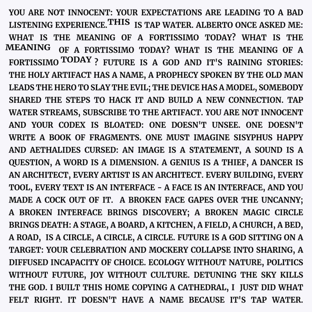 In the texts I wrote for the album, I often repeat, “You never write a book of fragments \ the truth of a text is never really written anywhere”, quoting Eugene Thacker and Rosi Braidotti. Those are two very important concepts for me, as I feel that, put simply, having a polyphonic relationship of meaning between elements gives the listener a much more fulfilling experience than just explaining everything – a huge problem today, in an era of clubs filled with conceptual music (I see the irony in saying so in this interview) and cinemas filled with expanded universes. Remember that a sound is a question, and not even Tolkien explained everything.