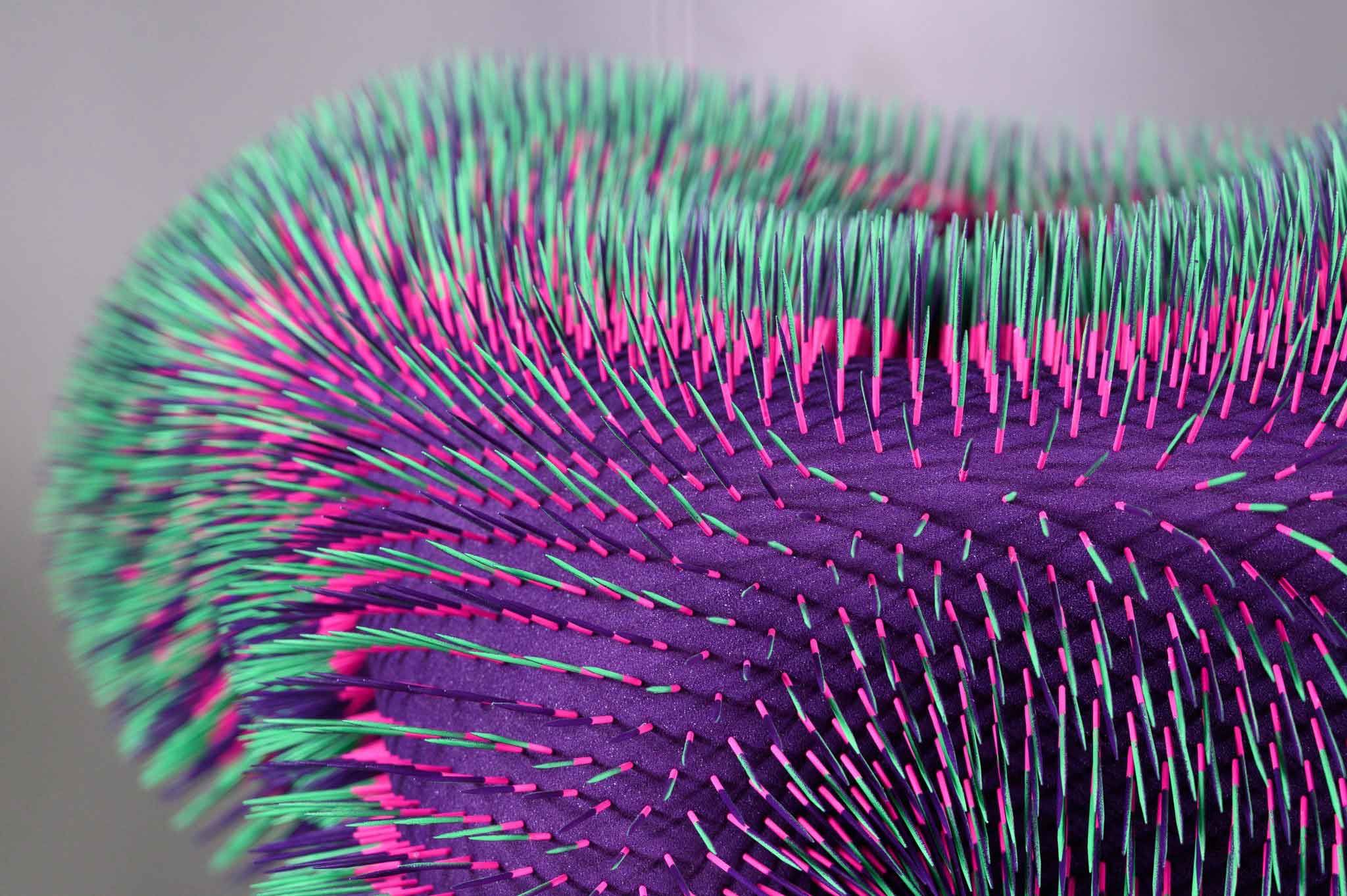 I like to use elementary components. The spines in “Doing nothing with AI 2.0“ are just 23.000 toothpicks coloured in foam. And people see it and think it is super unique and complicated, but it is the most ordinary thing that many of us have at home. The colour scheme makes it seem like something strange. The second version is made with cable ties to create that translucent skin. I was mostly inspired by sea worlds and digital artists working on relatable projects two to three years ago, like Zeitguised, Vincent Schwenk and Madeline Gannon with the Artwork Manus.