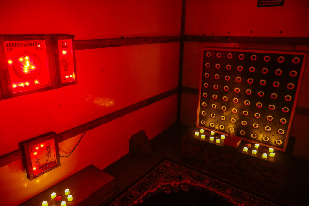 In a similar fashion, Palaima recently presented a roaming exhibition, The Church of the Electric God [2] in New York, which he described as a psychoacoustic spatial drone temple in the back of a (U-Haul). At the centre of this space was his piece CHOIR-64, a psychoacoustic instrument and composition system which broadcast the musical composition Spatial Etude No.1, a long-form generative drone piece where tones change gradually over time. The sculpture highlights Palaima’s belief in sound as a spiritual force and generates a profound sensory experience for those who experience it. Visitors to the The Church of the Electric God were transported out of their immediate reality and forced to reckon with the divine nature of electronics. The meditative chorus of CHOIR-64 drew one into a hypnotic state of worship.