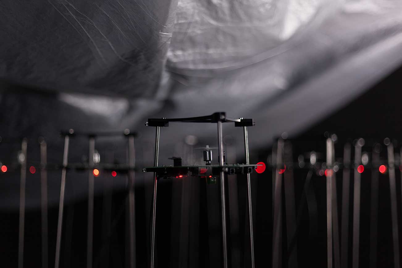 Her most recent work, Indisposable (2019-2020), investigates the spatiality of plastics and the politics they hold in spaces as partaking materials. Emerging from a plastic sheet that is stimulated by multiple wind-producing machines from below, together they enact the plastic sheet’s wave-like movements. The installation is conceptualised and built around concerns about plastics’ influential role in the realms of contemporary geology and ecology and aims at amplifying their powerful spatial-political agency. Along with the production of undulations, Indisposable focuses on the spatiality of plastics in the example of bodies of water.